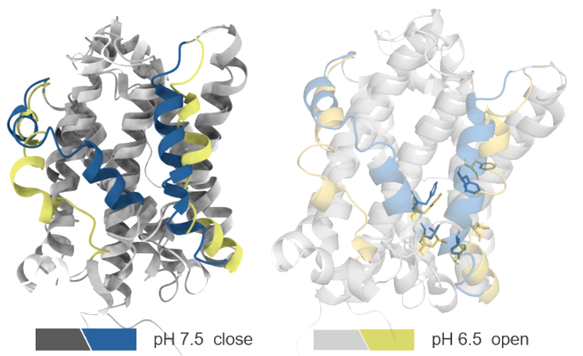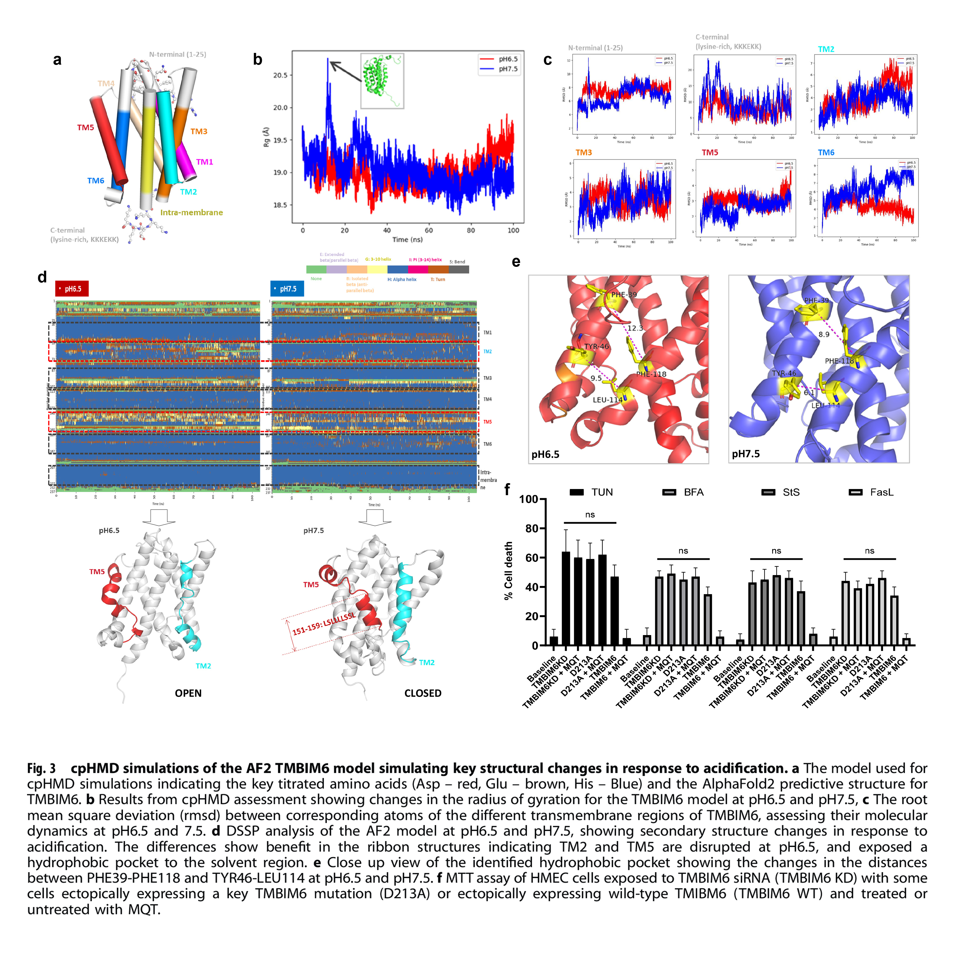 为了进一步研究和阐明TMBIM6蛋白分子构象变化对其功能发挥的关键作用,维亚生物AIDD/CADD团队通过对TMBIM6进行结构建模与优化,并引入能够模拟蛋白质在不同pH条件下的动态构象行为的CpHMD分子动力学模拟技术模拟其在不同pH条件下的构象变化。维亚团队研究发现,在低pH环境下,TMBIM6的跨膜区域和α-螺旋结构发生了显著变化,这一发现可能揭示了TMBIM6在细胞应激反应和癌细胞死亡调控中的关键分子机制。此外,通过把CpHMD的模拟结果与湿实验数据进行交叉验证,进一步确保了结果的科学性和生物学相关性,从而解释了分子结构变化对于其生物学功能的影响。通过精确模拟蛋白质在动态环境中的行为及分析关键残基的作用机制,为靶向TMBIM6的药物设计提供了坚实的理论和结构基础。这也充分展示了维亚生物AIDD/CADD团队在新靶点新机制研究领域的能力。