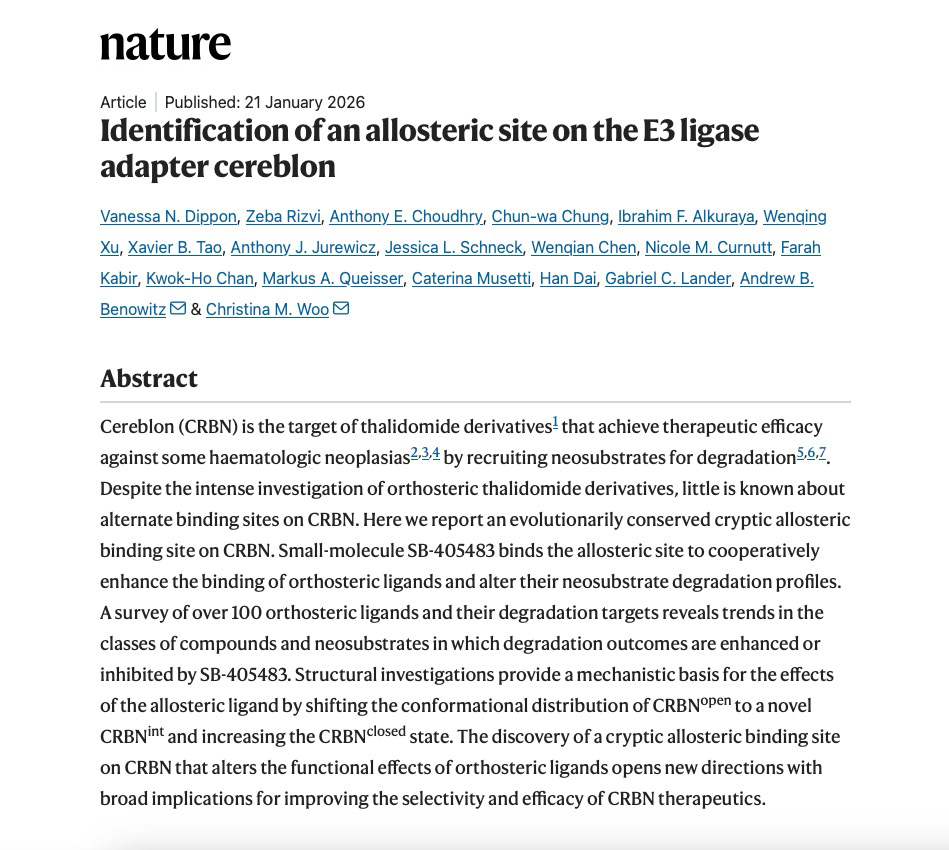 近日,这一领域迎来重要突破。一项发表于国际顶级学术期刊《Nature》的研究,首次发现并鉴定了E3泛素连接酶适配蛋白CRBN上的一个进化保守的变构结合位点,为改善CRBN靶向药物的选择性与功能谱提供了全新的理论与结构依据。该研究题为“Identification of an allosteric site on the E3 ligase adapter cereblon”,由哈佛大学化学与化学生物学系、Scripps研究所及葛兰素史克(GSK)等多家国际顶尖科研机构联合完成。