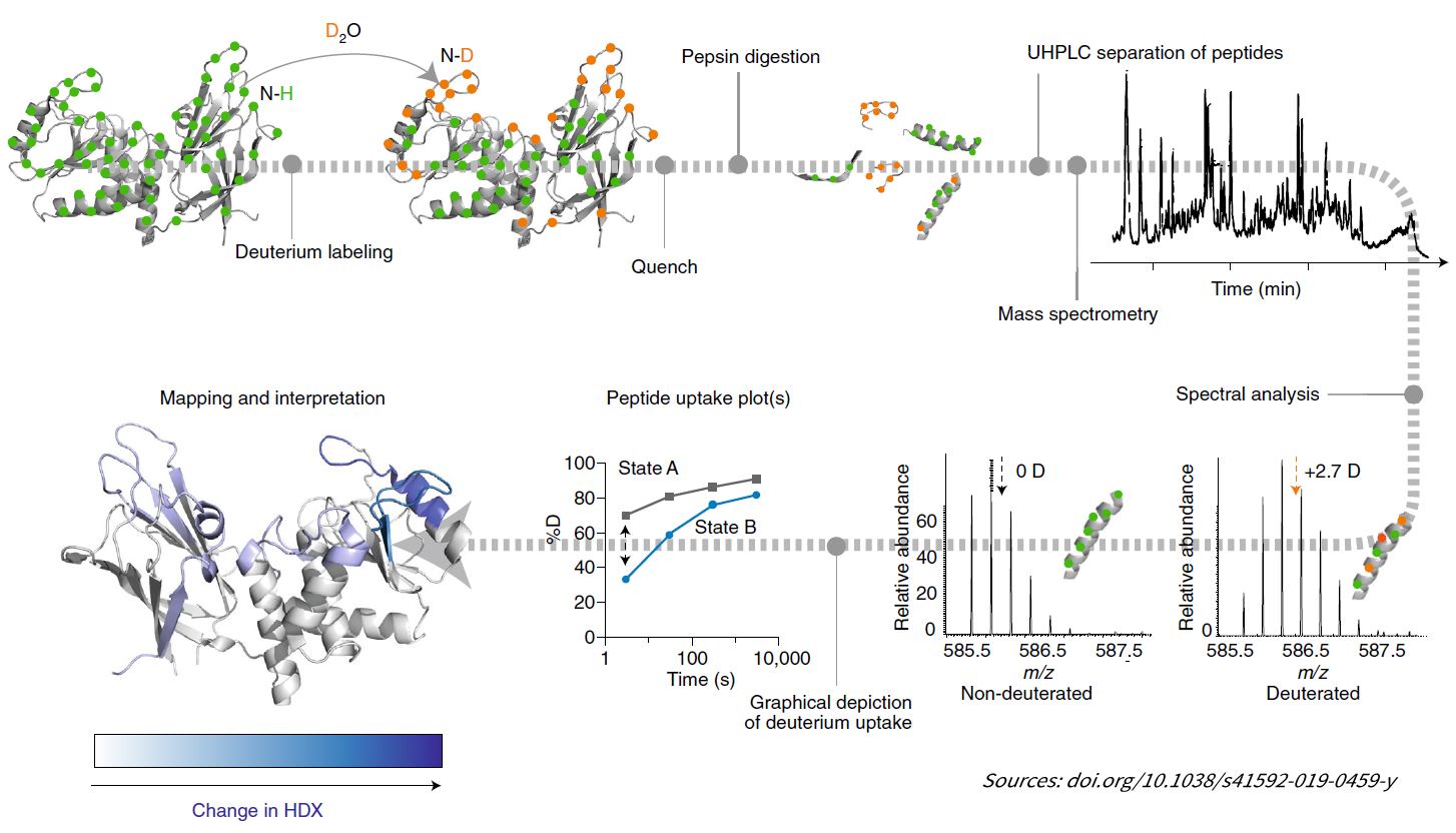 HDX-MS技术(氢氘交换质谱),是一种研究蛋白质空间构象的质谱技术。其原理是将蛋白质浸入氘水溶液中,蛋白分子主链中的酰胺氢以不同的速率与溶液中的氘发生交换,这在一定程度上依赖于构型,进而通过质谱检测确定蛋白质不同序列片段的氢氘交换速率,从而得出蛋白质空间结构相关信息,推测出不同位点的活性程度。